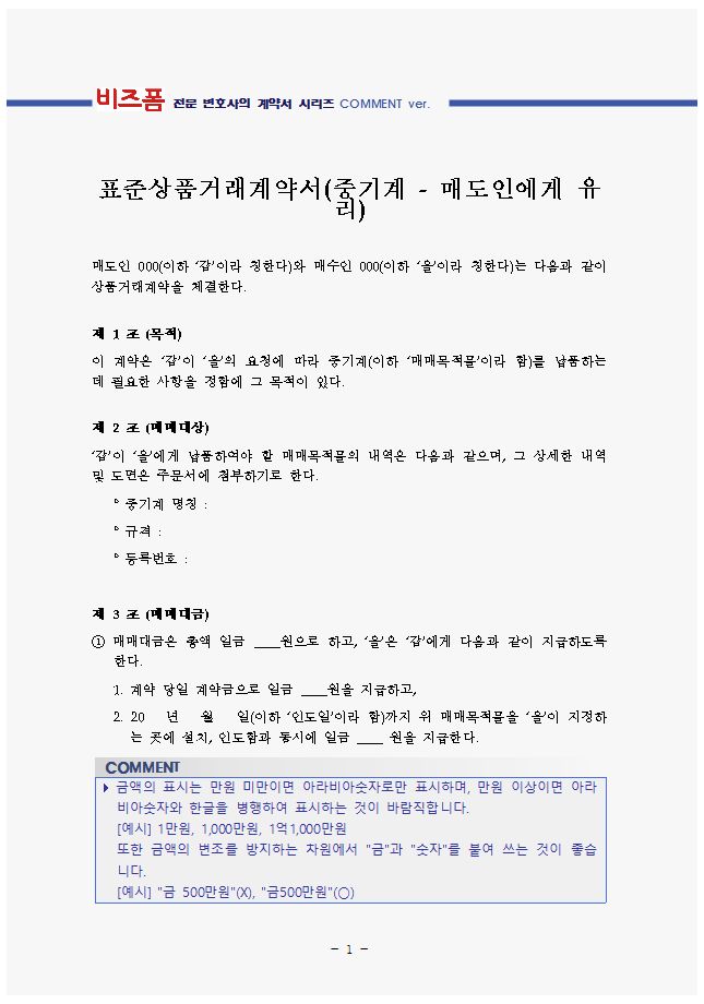 9,000원/월표준적인 상품거래계약서인데, 물건을 판매하는 쪽, 매도인에게 유리한 내용이 많이 포함된 계약서입니다. 매수인의 입장에서 계약을 하시는 분들은 별도의 ´매수인에게 유리한 계약서´를 참고하시기 바랍니다.