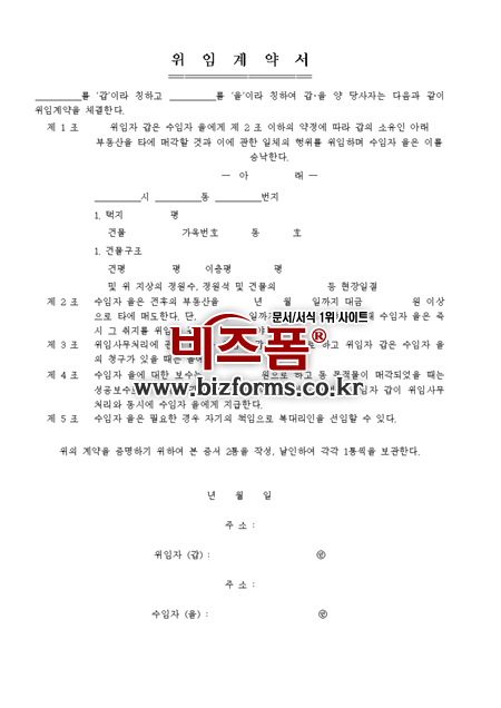 위임자는 수임자에게 약정에 따라 위임자의 소유인 아래 부동산을 타에 매각할 것과 이에 관한 일체의 행위를 위임하며 수임자는 이를 승낙함을 나타내느 계약서 양식입니다. .
