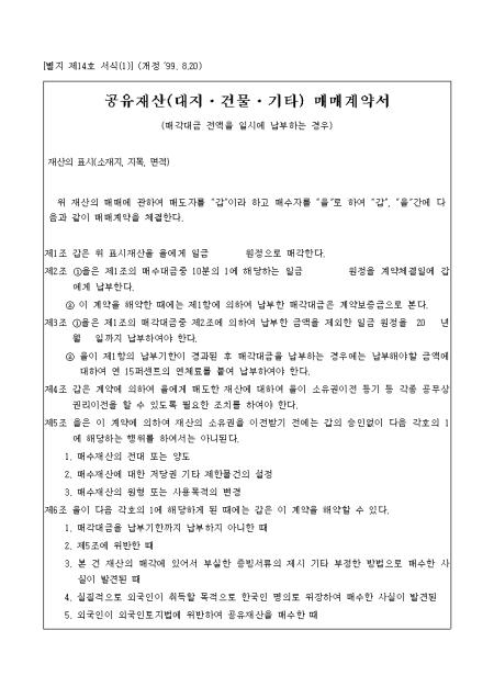 별지 제14호서식으로 공유재산(대지,건물,기타) 매매계약서입니다.