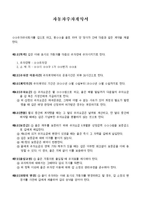 자동차 주차계약서 양식입니다. 제1조[목적] 갑은 아래 표시의 자동차를 다음의 주차장에 주차시키기로 한다. 1. 주차장명 : ○○주차장 2. 소 재 지 : ○○시 ○○구 1가 ○○번지 ○○호 제2조[주차장 이용시간] 주차계약에서의 공용시간은 하루 24시간으로 한다. 제3조[계약기간] 주차계약의 기간은 19○○년 ○월 ○일부터 19○○년 ○월 ○일까지로 한다.