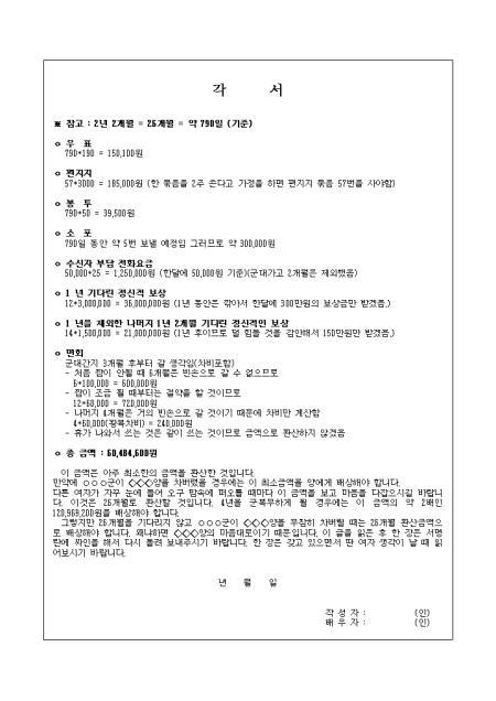 여자들이 군대를 가는 남자에게 받을 수 있는 각서 양식입니다. 각기 내용은 달라질 수 있으나 재밌고 기발한 서식입니다.^^ 각 세부내용들을 이용해 계약서도 활용하시면 좋겠네요..