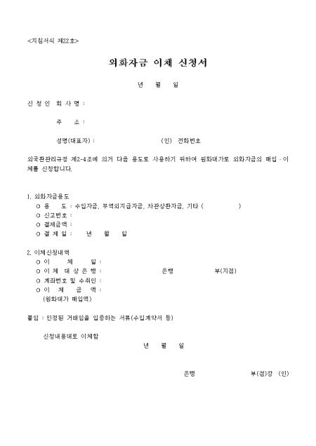 외화자금이체신청서입니다. 외국환관리규정 제2-4조에 의거 다음 용도로 사용하기 위하여 원화대가로 외화자금의 매입 혹은 이채를 신청하는 내용입니다.