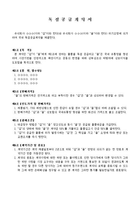 목적, 품명, 월수량, 판매지역 등 9개 조항으로 구성되어있는 독점공급계약서입니다.