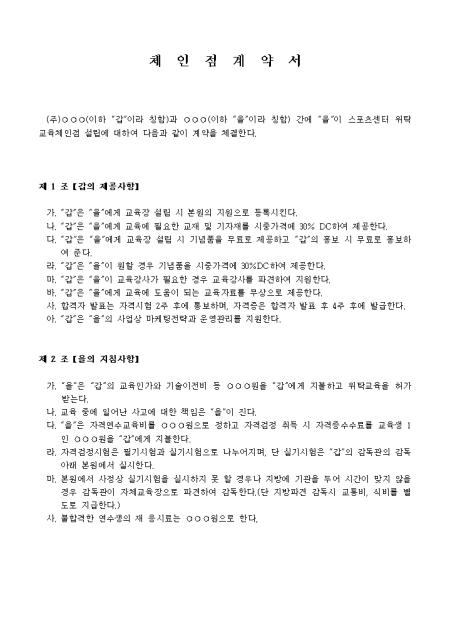 갑의 제공사항, 을의 지침사항, 을의 의무사항 등 4개 조항으로 구성되어있는 스포츠센터 위탁교육 체인점계약서입니다.