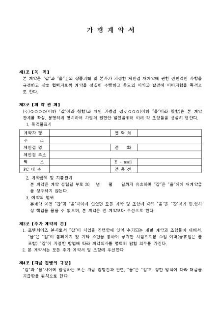 목적, 계약관계, 추가 계약의 건, 자금 집행의 건 등 16개 조항으로 구성되어있는 PC방 체인점계약서입니다.