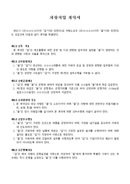 목적, 이용범위, 대금결제 등 13개 조항으로 구성되어있는 차량 지입계약서입니다.