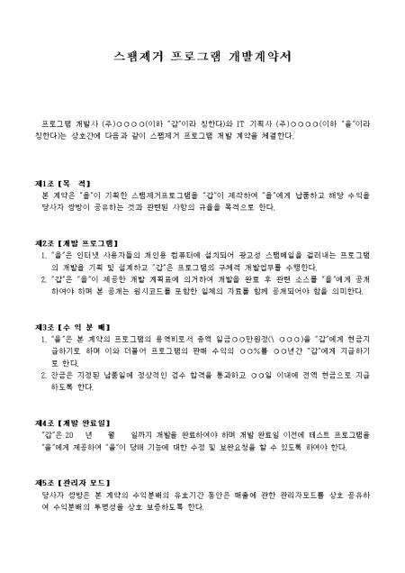 목적, 수익분배, 개발 완료일 등 17개 조항으로 구성되어있는 스팸제거프로그램 개발계약서입니다.