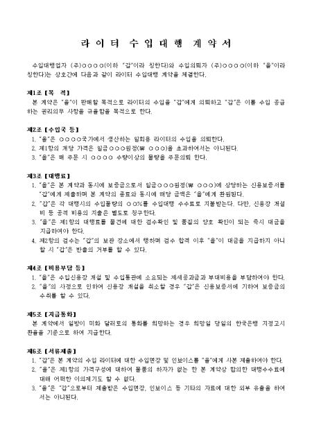 목적, 수입국, 대행료 등 12개 조항으로 구성되어있는 라이터 수입대행계약서입니다.