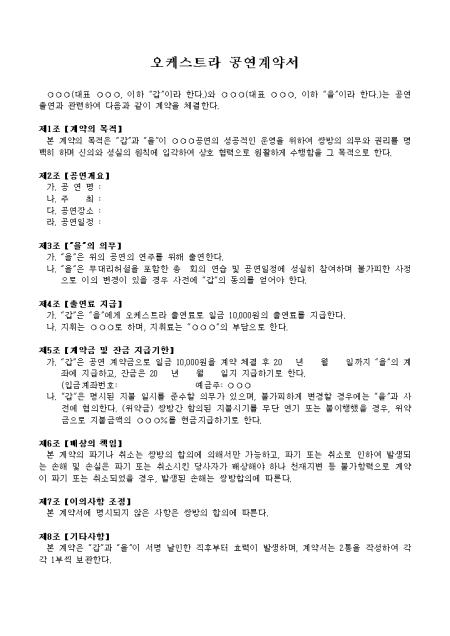계약의 목적, 공연개요, 을의 의무, 출연료 지급 등 8개 조항으로 구성되어있는 오케스트라 공연계약서입니다.