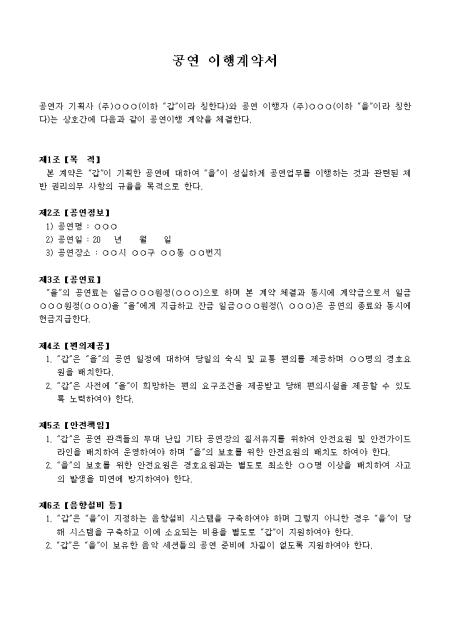 목적, 공연정보, 공연료, 편의제공 등 12개 조항으로 구성되어있는 공연이행계약서입니다.