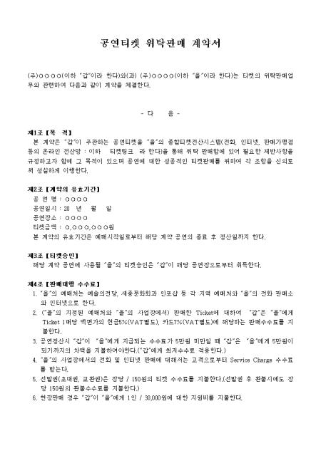 목적, 계약의 유효기간, 티켓승인 등 13개 조항으로 구성되어있는 공연티켓위탁판매계약서입니다.
