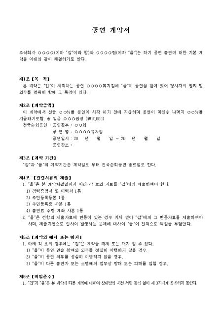 목적, 계약금액, 계약기간 등 9개 조항으로 구성되어있는 공연계약서입니다.