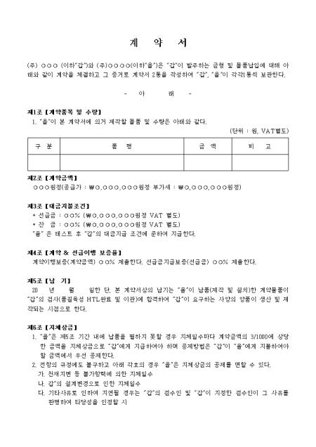 계약품목 및 수량, 계약금액, 대금지불조건 등 15개 조항으로 구성되어있는 금형계약서입니다.