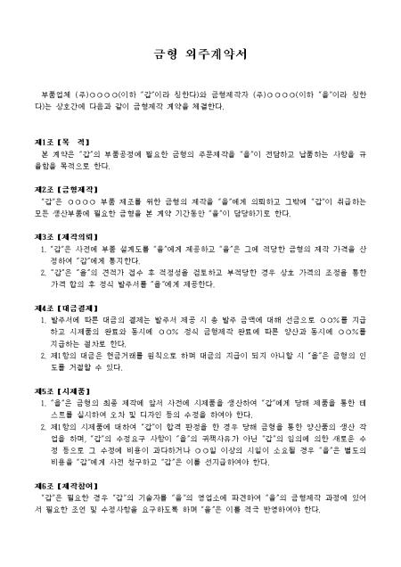 목적, 금형제작, 제작의뢰 등 14개 조항으로 구성되어있는 금형계약서입니다.