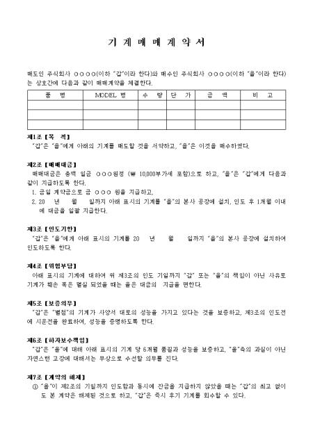 목적, 매매대금, 인도기한 등 7개 조항으로 구성되어있는 기계매매계약서입니다.