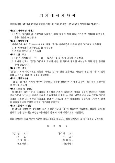 매매대상 기계, 매매대금, 인도 등 7개 조항으로 구성되어있는 기계매매계약서입니다.