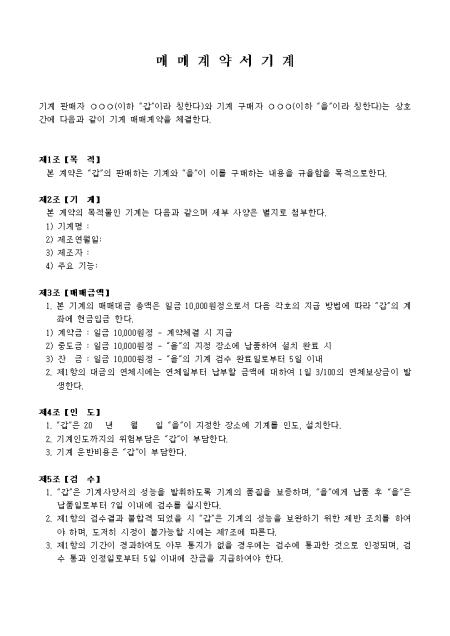 목적, 기계, 매매금액, 인도 등 11개 조항으로 구성되어있는 기계매매계약서입니다.