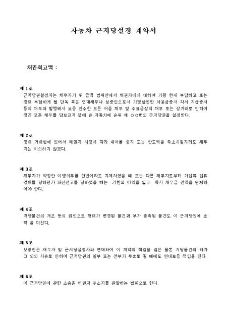 6개 조항으로 구성되어있는 자동차 근저당설정 계약서입니다.