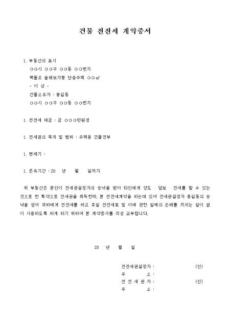 부동산의 표시, 대금, 목적 및 범위 등의 항목으로 구성되어있는 전전세계약서입니다.