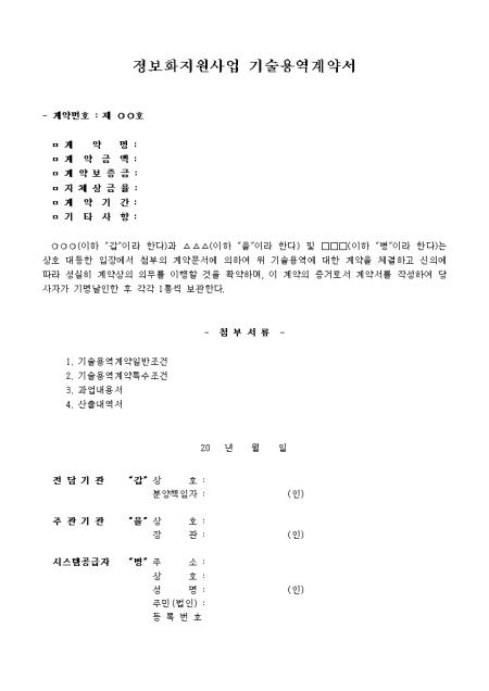 기술용역계약일반조건, 기술용역계약특수조건 등의 항목으로 구성되어있는 정보화지원사업 기술용역계약서입니다.