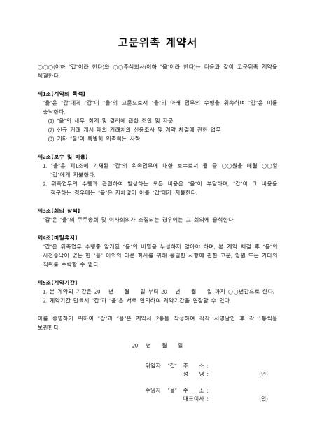 계약의 목적, 보수 및 비용, 회의 참석, 비밀유지, 계약기간 등의 5개조항으로 구성된 고문위촉계약서 양식입니다.