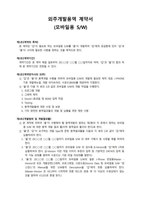 계약의 목적, 계약기간, 계약당사자 의무, 개발범위 및 개발결과물 등 19개 조항으로 구성되어있는 모바일용 소프트웨어 외주개발용역계약서입니다.