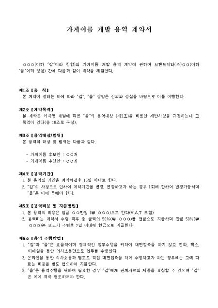 총칙, 계약목적, 용역대상/범위, 용역기간 등 10개 조항으로 구성되어있는 가게이름 개발 용역계약서입니다.