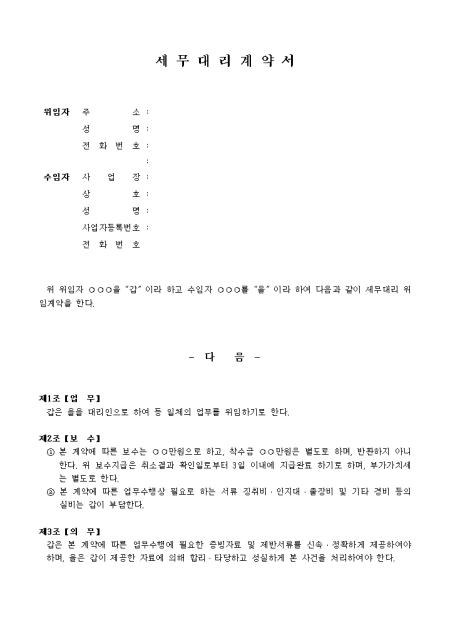 업무, 보수, 의무, 책임, 비밀보장 등 6개조항으로 구성된 세무대리계약서 양식입니다.