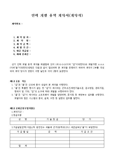 총칙, 대금청구 및 지불, 계약해제 및 손해 배상청구 등 10개 조항으로 구성되어있는 계약직 인력개발용역계약서입니다.