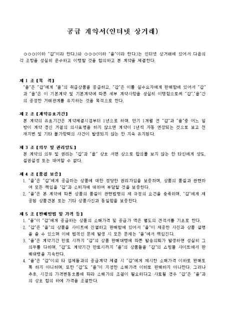 목적, 계약유효기간, 의무 및 권리양도, 품질 보증 등 11개 조항으로 구성되어있는 인터넷 상거래 공급 계약서입니다.