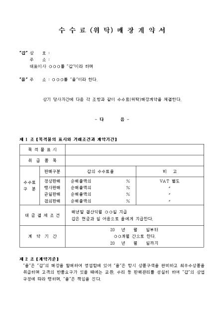 목적물의 표시와 거래조건과 계약기간, 계약기준, 최저기준매출액, 시설 등의 관리 등 26개 조항으로 구성되어있는 수수료위탁매장계약서입니다.