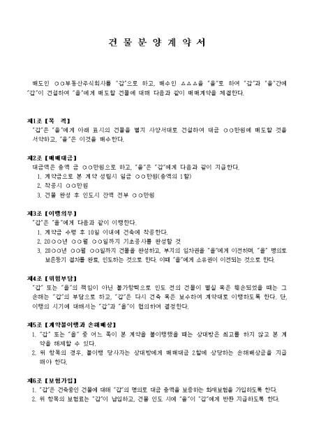 매도할 건물에 대해 매매계약을 체결한다는 내용의 목적, 매매대금, 이행의무, 위험부담, 보험가입, 비용부담 등 8개조항으로 구성된 건물분양계약서 양식입니다.