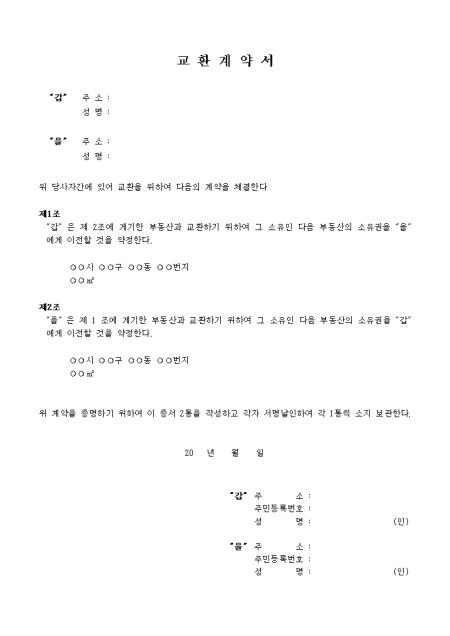 당사자간에 있어 교환을 위하여 다음의 계약을 체결한다는 내용의 2개조항으로 구성된 교환계약서 양식입니다.