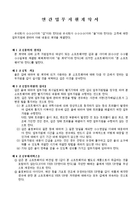 용어의 정의, 목적, 업무지원의 실시, 부대서비스 등 14개 조항으로 구성되어있는 연간 업무지원계약서입니다.