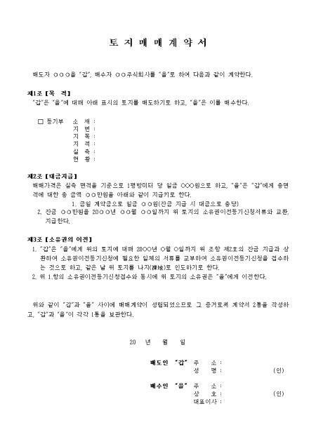 목적, 대금지급, 소유권의 이전 등의 3개조항으로 구성된 토지매매계약서 양식입니다.