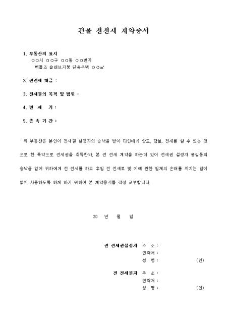 부동산의 표시, 전전세대금, 전세권의 목적 및 범위, 변제기, 존속기간등 5개항을로 구성된 건물 전전세 계약증서 양식입니다.