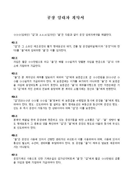임대인과 임차인은 다음과 같이 임대차계약을 체결한다는 내용의 20조항으로 구성된 공장 임대차 계약서 양식입니다.