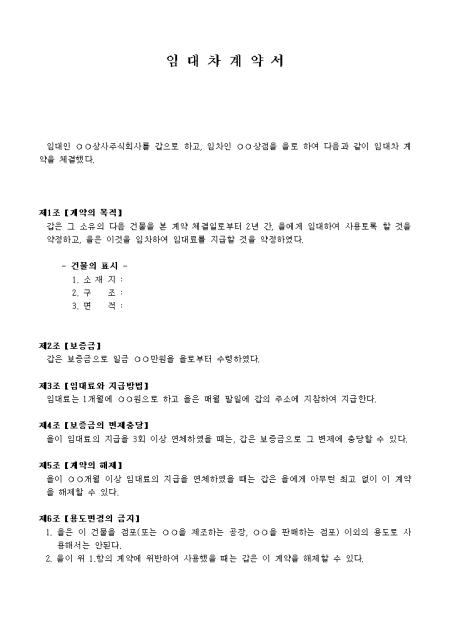 계약의 목적, 보증금, 임대료와 지급방법, 보증금의 변제충당, 계약의 해제, 용도변경의 금지 등 7개조항으로 구성된 임대차계약서 양식입니다.