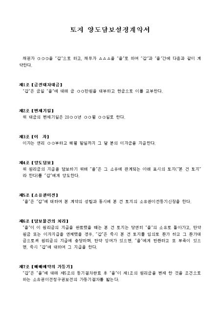 금전대차대금, 변제기일, 이자, 양도담보 등 9개 조항으로 구성되어있는 토지양도담보설정계약서입니다.
