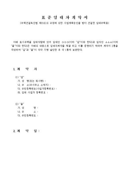 임대보증금 임대료 및 임대차기간, 임대주택의 입주일, 임대료의 계산, 관리비와 사용료, 임대조건 등의 변경 등의 14개조항으로 구성된 표준임대차계약서 양식입니다.