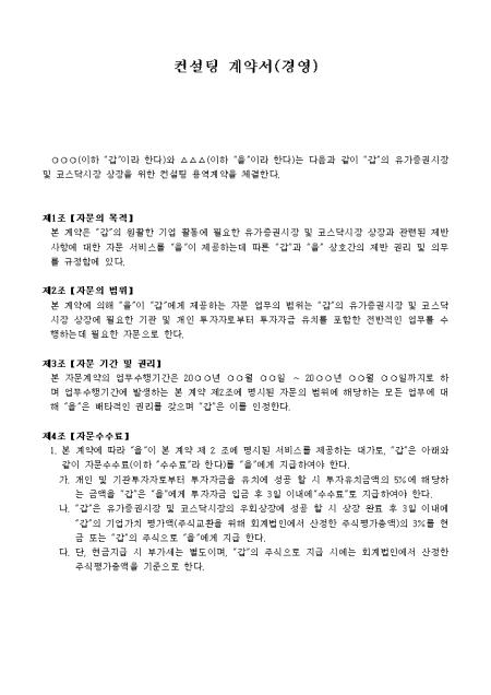 자문의 목적, 자문의 범위, 자문기간 및 권리, 자문수수료 등의 10개조 항으로 구성된 컨설팅계약서 양식입니다.
