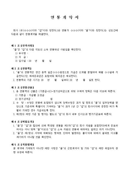 수당은 연봉에 포함되지 않으며 능력수당은 과거 및 향후 업무능력을 판단으로 기준하여 지급하기로 규정해 놓은 연봉계약서입니다. 인적사항, 연봉액, 연봉산출, 비밀유지 등 7개 조항으로 구성되어있습니다.