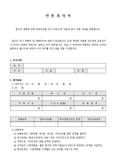 연봉 총액에 기본연봉, 제수당, 상여금, 기타수당을 포함하여 책정해 놓은 연봉계약서입니다. 인사사항, 계약내용 등의 항목으로 구성되어있으며 연봉협상 시 사용합니다.