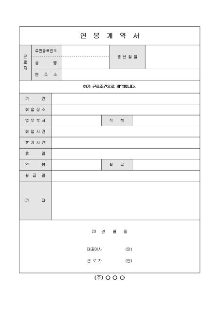 연봉계약 시 사용할 수 있는 연봉계약서 양식입니다. 근로자의 인적사항, 기간, 취업장소, 업무부서, 직책 등의 항목으로 구성되어있으며 1장의 표로 구성되어있습니다.