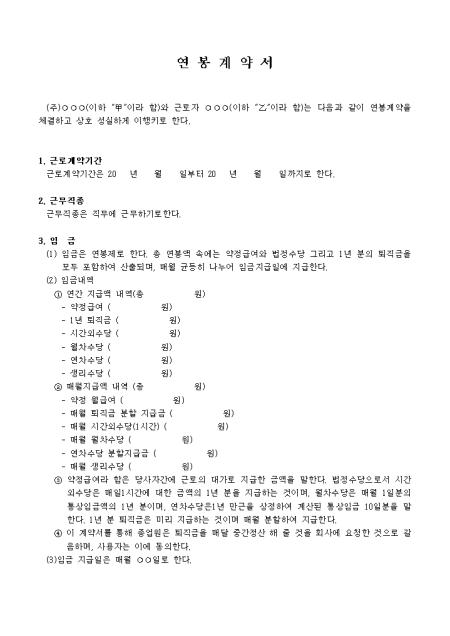 총 연봉액 속에는 약정급여와 법정수당 그리고 1년 분의 퇴직금을 모두 포함하여 산출하며, 매월 균등히 나누어 임금지급일에 지급함을 규정해 놓은 연봉계약서입니다. 근로계약기간, 근무직종, 임금, 근로시간 등 8개 조항으로 구성되어있습니다.