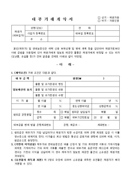 계약조건, 기한의 이익상실, 유전물의 취득과 처분, 연대보증인 등의 항목으로 구성되어있는 대부거래계약서입니다.