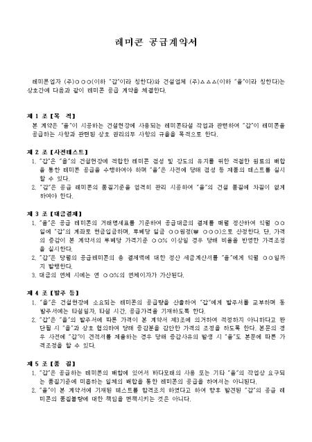건설업자가 레미콘 업자로부터 레미콘을 공급받는 내용으로 구성된 레미콘 공급계약서입니다.