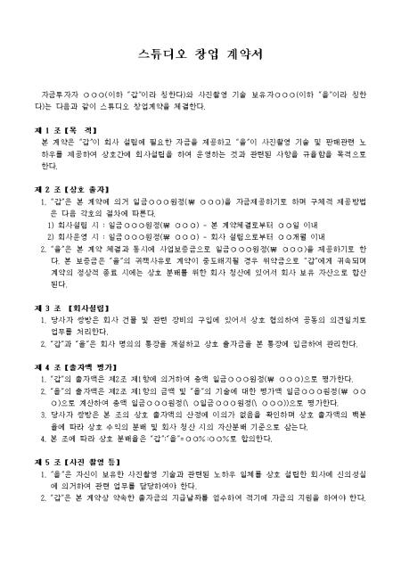 목적, 상호출자, 회사설립, 출자액 평가, 사진 촬영 등 16개 조항으로 구성되어있는 스튜디오 창업 계약서입니다.