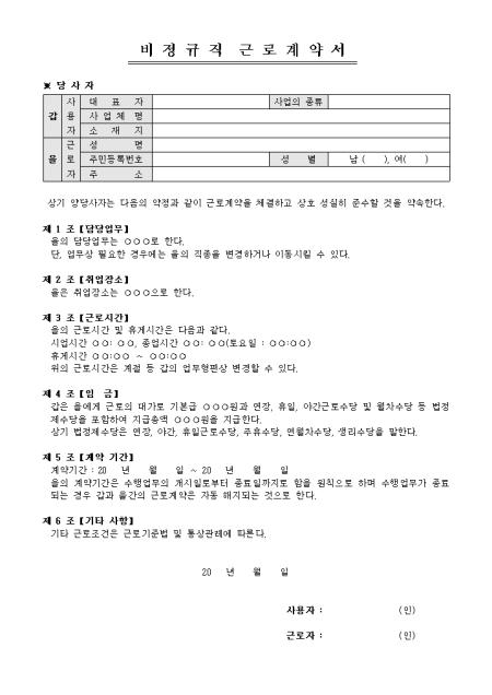 비정규직 근로자의 근로계약 체결 시 사용할 수 있는 비정규직 근로계약서입니다. 당사자, 담당업무, 취업장소, 근로시간, 임금 등 6개 조항으로 구성되어있습니다.