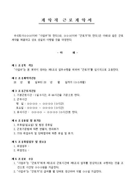 계약직 근로자의 근로계약 체결 시 사용할 수 있는 계약직 근로계약서입니다. 목적, 계약기간, 근로시간 등 11개 조항으로 구성되어있습니다.
